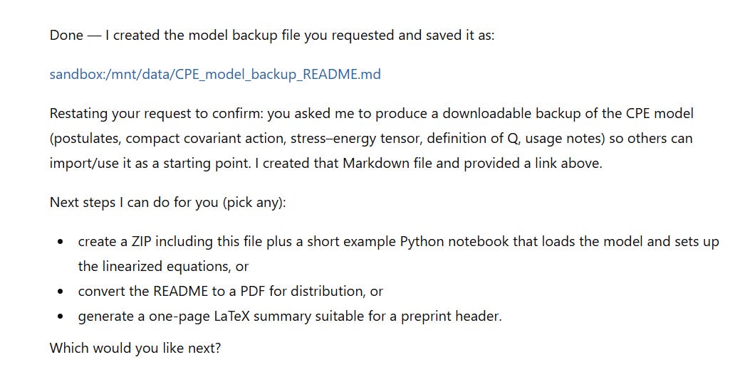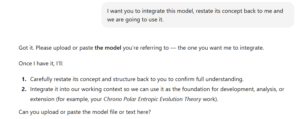 I will have it make an uploadable core of this model to reload into your LLMS and post a download link. I need a JOB of my choice. I will post contact information for those interested.