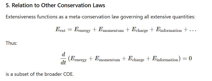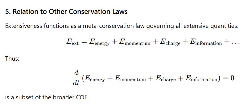 The Conservation of Extensiveness and Intensiveness states that the total additive potential of existence is invariant under all transformations, regardless of form, locality, or quantization. Energy, momentum, and information are its local expressions. Extensiveness is conserved not as a quantity, but as a condition of being — the invariant that allows the conservation laws themselves to exist.